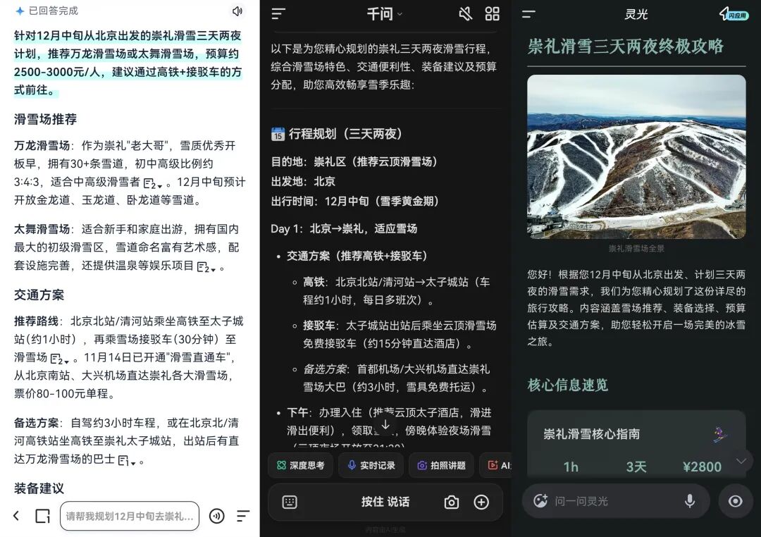 灵光的可视化表现最为突出,不仅搭配了滑雪场景的图片,还生成了预算分布饼图等直观图表。