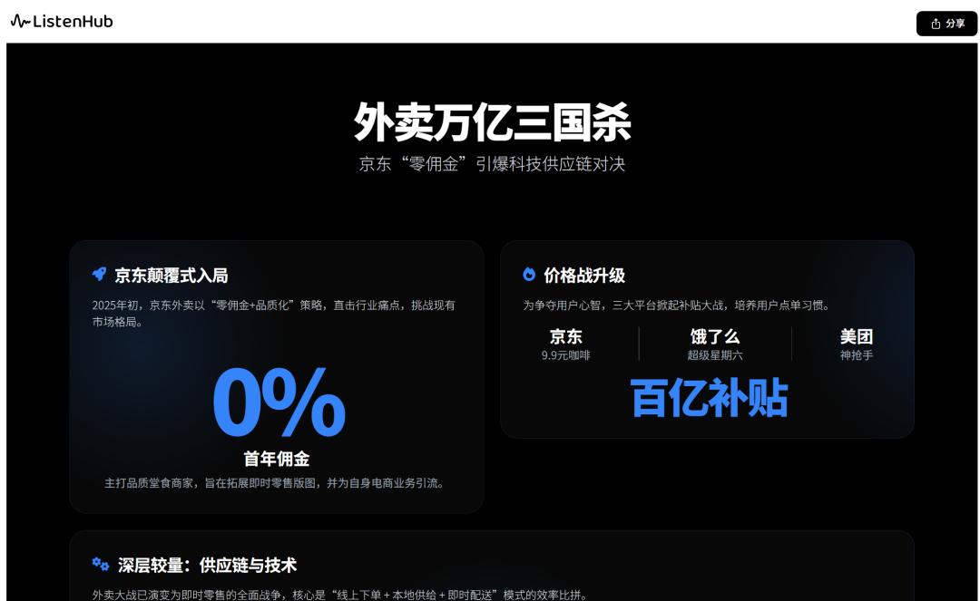 出乎意料的是,ListenHub凭着一个残缺的提示词找到了正确的方向,并生成了一段标题为“美团饿了么京东即时零售:万亿市场从‘三国杀’走向精细化”的播客。