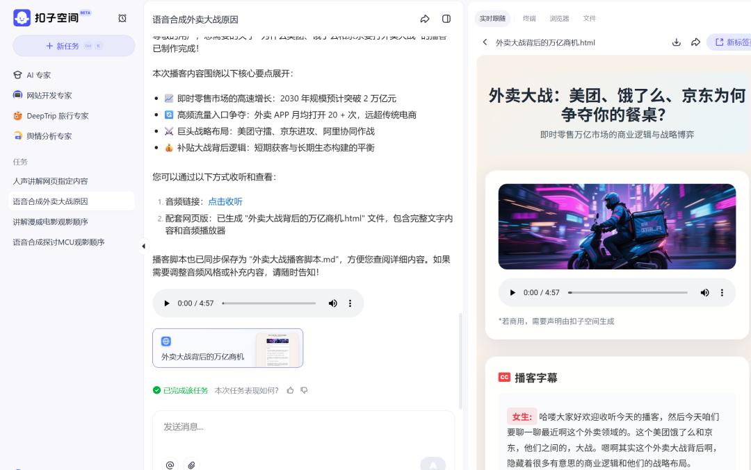 相比之下,扣子空间生成播客的速度会慢一些。它首先会访问用户提供的网页,判断这些信息是否足以回答提出的问题,然后撰写脚本、合成语音,最后还会制作一个HTML网页来呈现播客。和ListenHub类似,扣子也会提供脚本,但无法修改,且生成时间较长,图中的播客花了8分钟才生成出来。