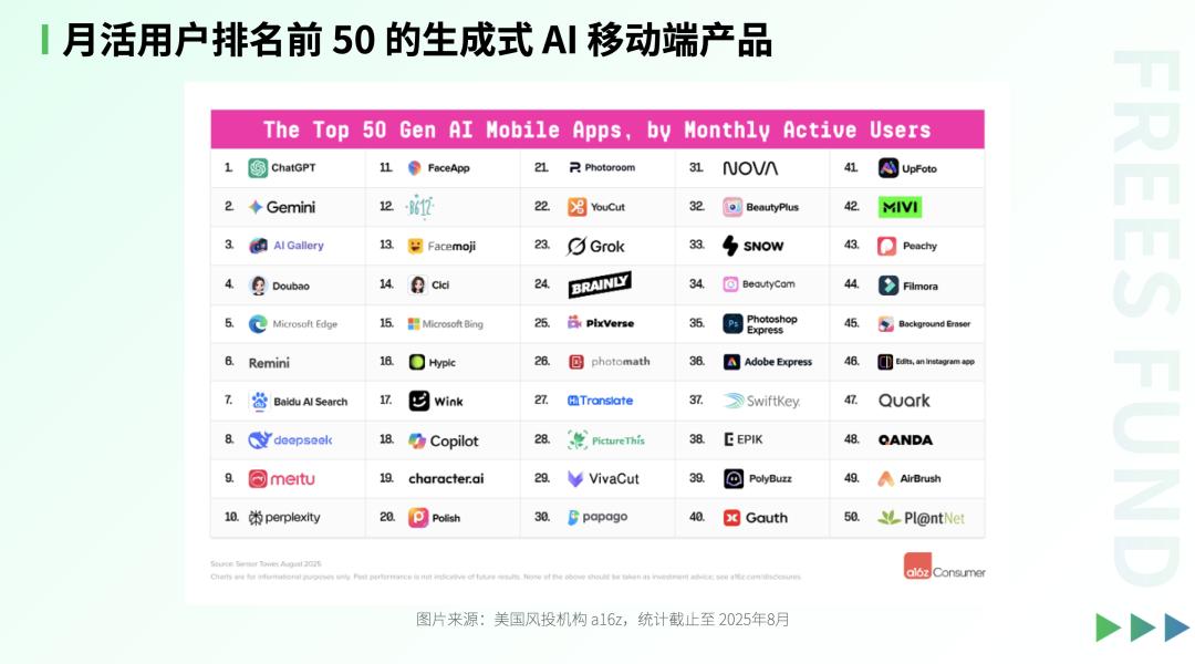 其中,中国团队的表现尤为亮眼。以夸克为例,根据美国风投机构a16z今年8月的统计,其全球网页端访问量已跻身第九,移动端(仅统计iOS手机客户端)则位列第47,若计入安卓手机客户端数据,排名有望进一步提升。类似地,DeepSeek、字节、阿里等大厂孵化的应用也在海外市场快速渗透。