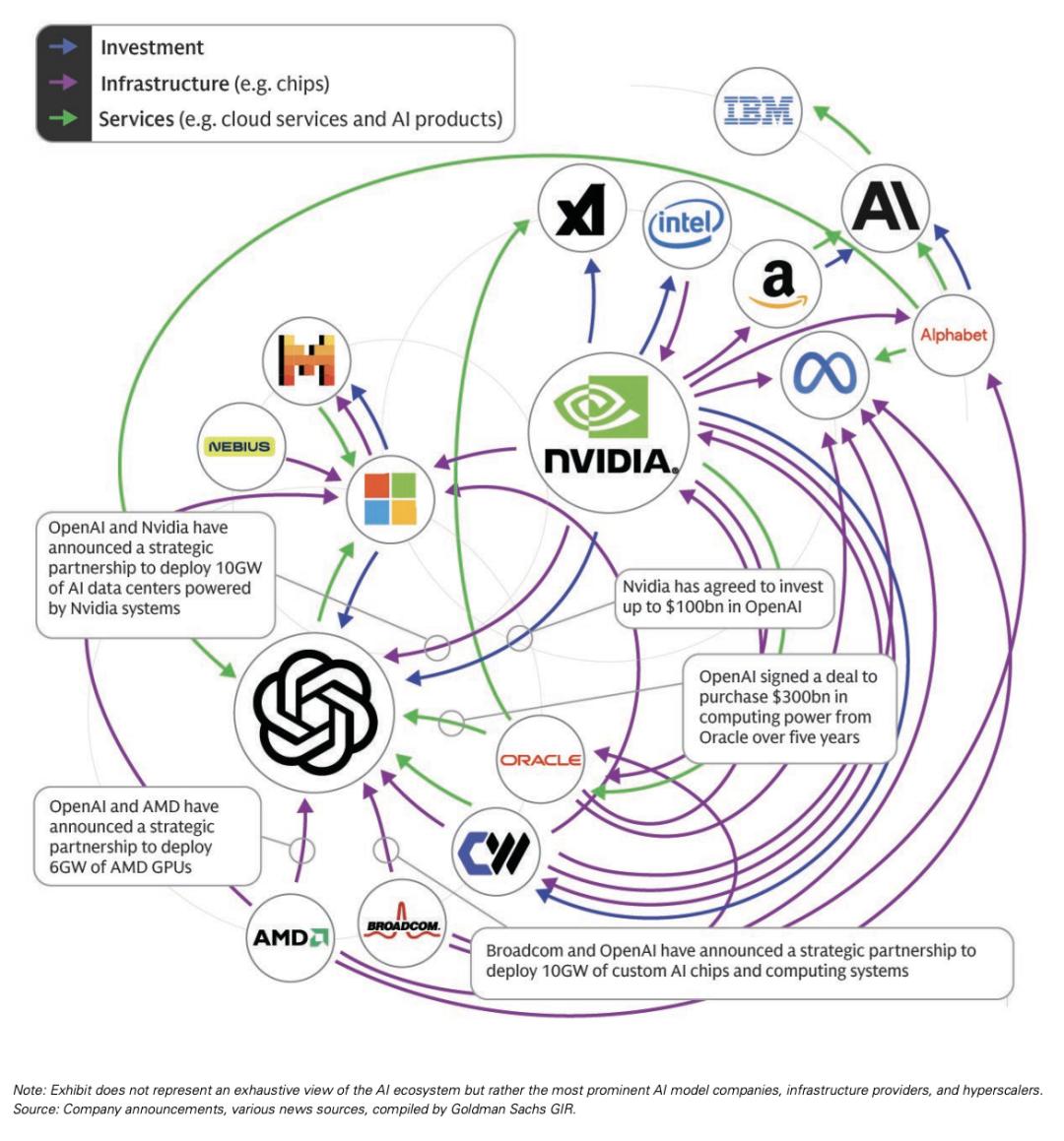 在产业生态层面,一个值得关注的现象是:AI行业正从依赖少数云厂商支持,转向多方参与的“循环式资金支持”模式。