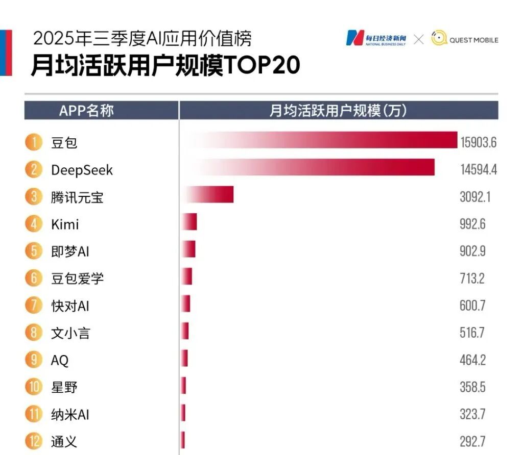 QuestMobile 的数据显示,今年第三季度豆包 App 的月活已经冲到 1.59 亿,超越了 DeepSeek,并且遥遥领先其他 AI 应用。同时,火山引擎的公有云大模型调用量份额更是逼近一半,日均 token 调用量突破三十万亿。