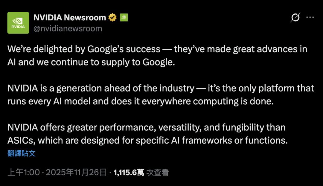 不单如此,Gemini 3 也彻底了扭转「Google 掉队论」,自研 TPU 也被视为英伟达算力霸权的最大变量,Meta 都被传出正评估大规模采购 TPU,直接让英伟达股价下跌近 7%,随后英伟达官方也在 X(原 Twitter)上发文称: