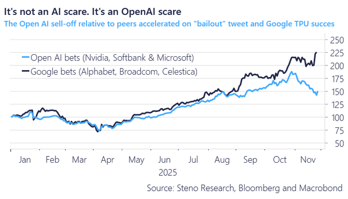 但这一切,正在被TPU改变。当谷歌上扬时,压力传递到英伟达、微软、以及大量接受英伟达投资并采购GPU的其他企业,如甲骨文和其他新云企业。对OpenAI的直接影响,是市场上普遍开始更看好TPU+Gemini在性能和成本上的长期竞争优势 ,要胜过OpenAI。而OpenAI在其星门计划中的巨额投资,在Gemini的压力之下,其商业可行性和可持续性,也受到市场的质疑。