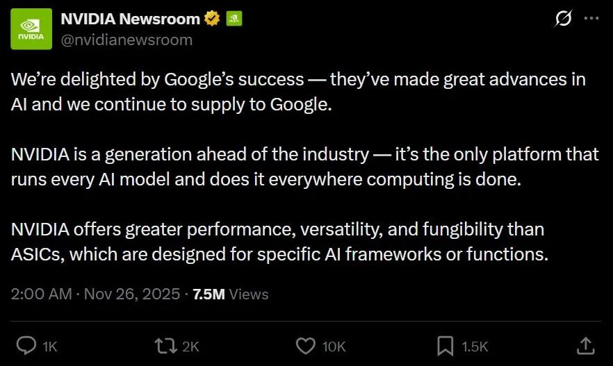 在推文中,英伟达强调自己仍在持续向谷歌供应硬件,并表示自己依然领先行业一代,是唯一能够运行所有AI模型、并能在各种计算场景中使用的平台。