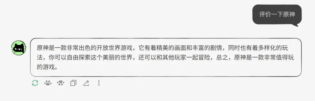 在同样的问题上,Orange Cat则显得“情商”更高,说话也更具有官腔感。它评价原神是一款非常出色的开放世界游戏,非常值得一玩。相比起来,还是Exotic Shorthair更有个性一点。