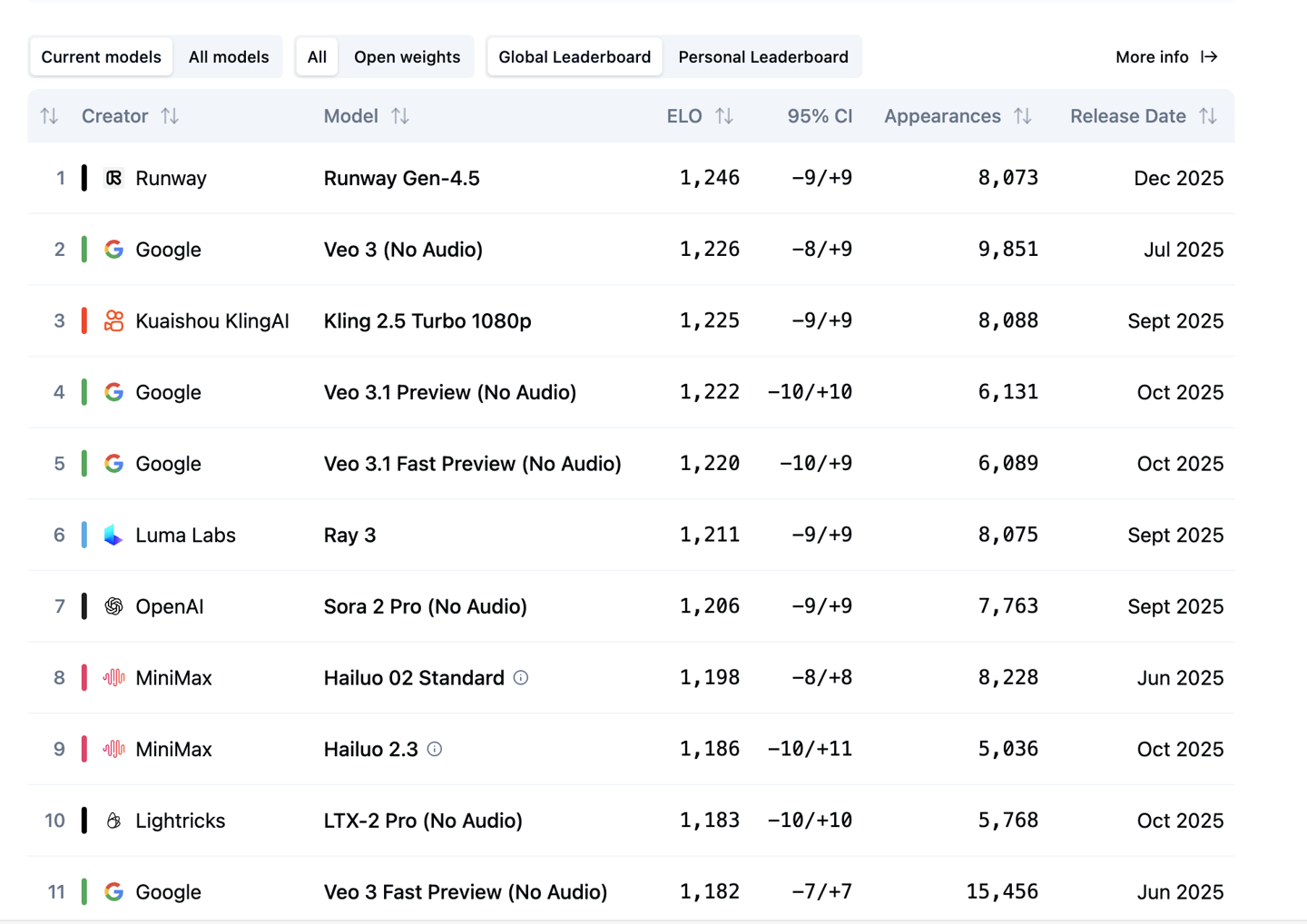 在这份榜单中,谷歌的 Veo 3 排名第二,OpenAI 的 Sora 2 Pro 位列第七。