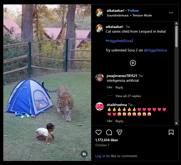 “它们反映了不真实的物种特性、行为、栖息地或物种间的关系。例如,我们看到捕食者和猎物一起玩耍。这些视频向我们展示的是具有人类行为的动物,这与现实相去甚远,”何塞・格雷罗解释说,“那段孩子在院子里玩耍、画面中有豹子的视频,会破坏这类物种的保护工作,因为在那种情况下,你根本不可能遇到豹子。”