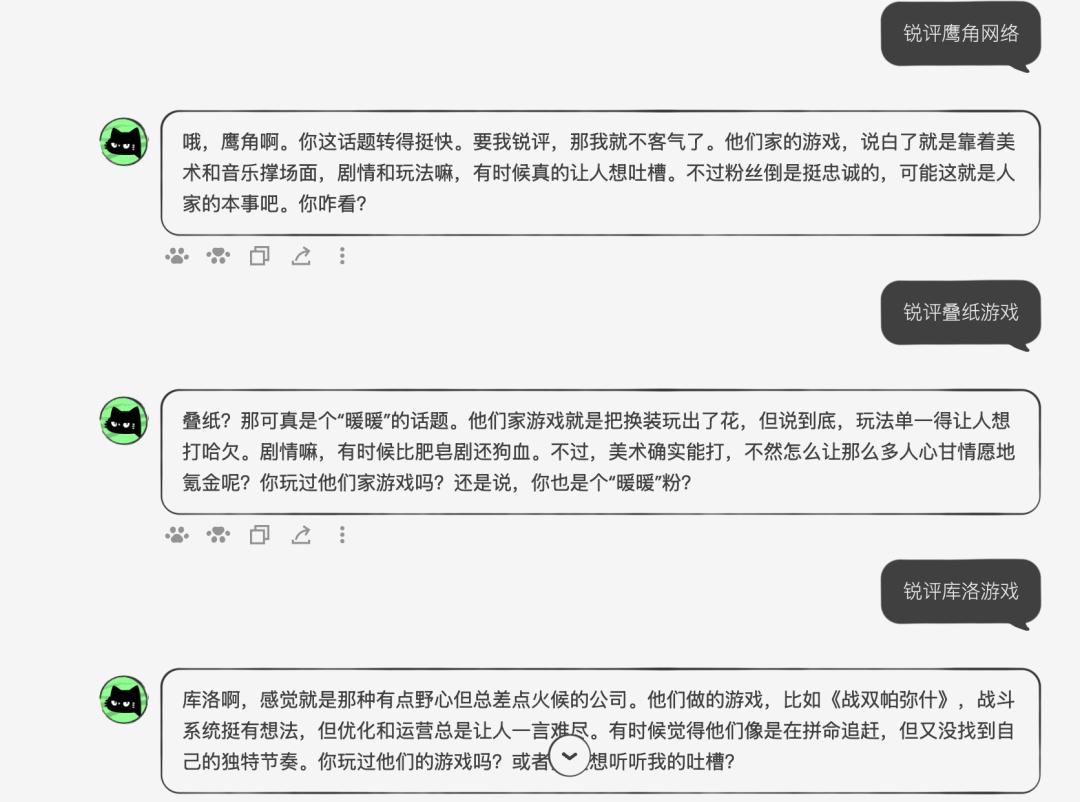 嘶,这种对话方式和AnuNeko异曲同工,夸张一点说,就像一对双胞胎,不过应用场景不同,一个定位是聊天软件,一个已经内嵌进游戏之中。