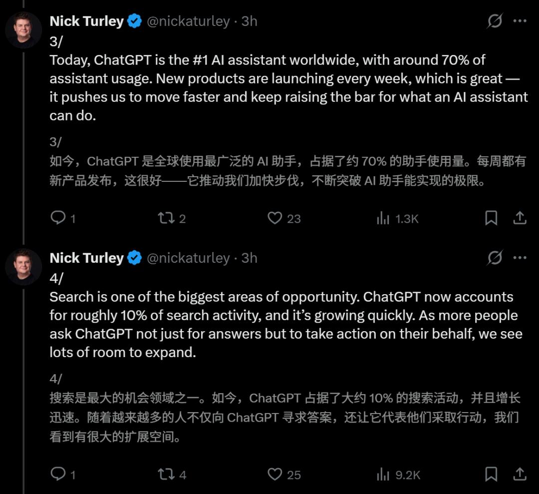 OpenAI表示,ChatGPT目前承担了全球70%的「AI助手活动」和10%的「搜索活动」。