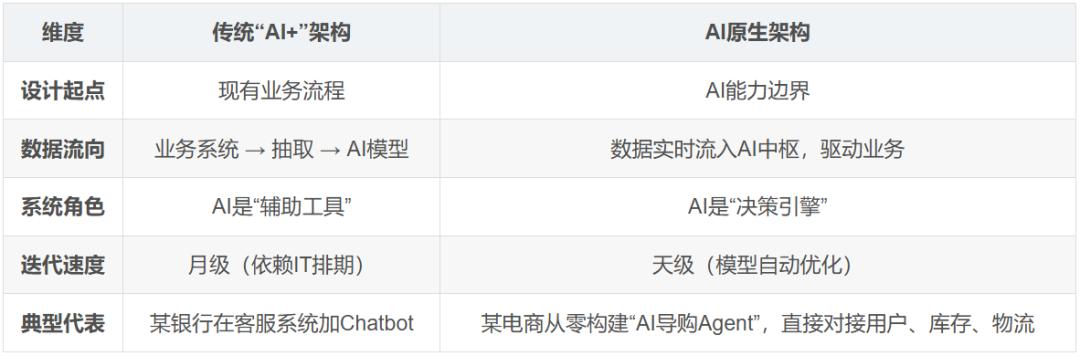 如果说“AI+”是在现有系统上“打补丁”或“外挂”AI功能,那么AI原生则意味着以AI为系统设计的底层逻辑与能力中枢,这套系统为AI而生、因AI而长,驱动从技术架构、业务流程、组织角色到价值创造方式的全方位重塑。