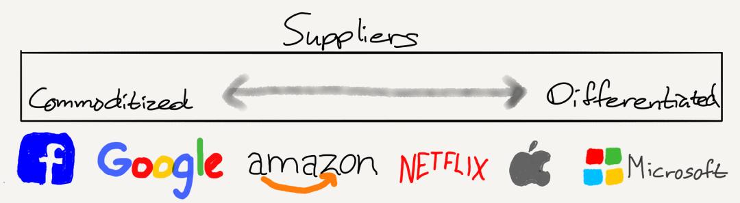右上角是平台型公司(如应用商店),通过赋能差异化供应商抽成获利