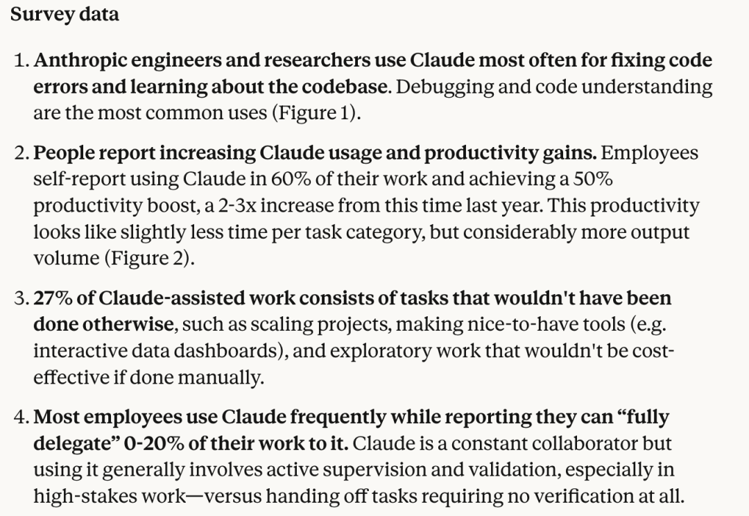 与此同时,Anthropic 最新发布(12 月 3 日)的内部深度调查《AI 如何改变工作》,正在揭示这场宏大叙事下微观个体的命运 —— 工程师的「空心化」和学徒制的崩溃。