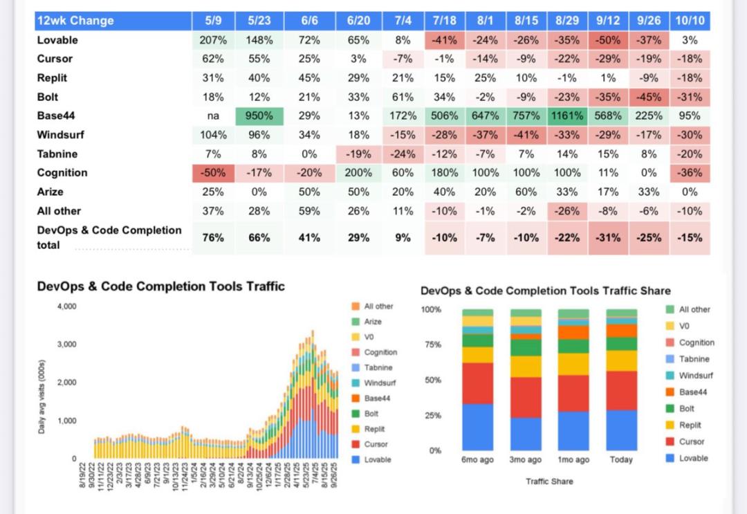 降幅最大的当属 Lovable,其流量在近几个月内从 3500 万掉到不足 2000 万,几乎砍半。其它几个明星产品也没好到哪里去,Bolt.new 下降了 27%,而 Vercel v0 自 5 月以来下降了 64%,Cursor、Replit、Devin 等平台也未能独善其身,唯一例外的是仍在依靠投放驱动的 Base44。