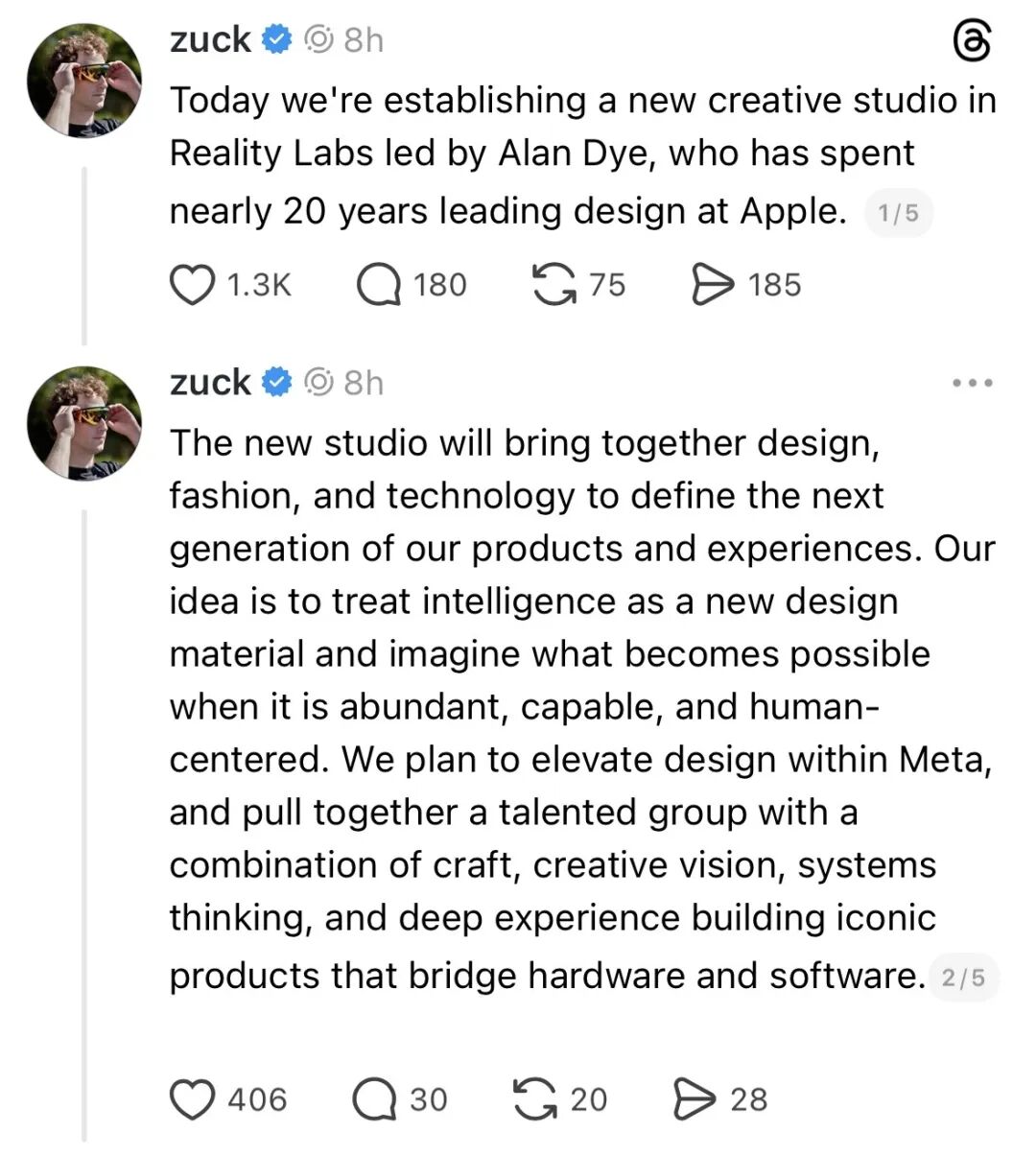 智东西12月4日消息,今天,Meta首席执行官马克·扎克伯格(Mark Zuckerberg)在社交平台Threads上发布帖子官宣,苹果人机交互设计副总裁、用户界面设计负责人艾伦·戴伊(Alan Dye)将加入Meta,并称“正在建立一个由戴伊领导的全新设计工作室,并将智能视为一种新的设计材料”。