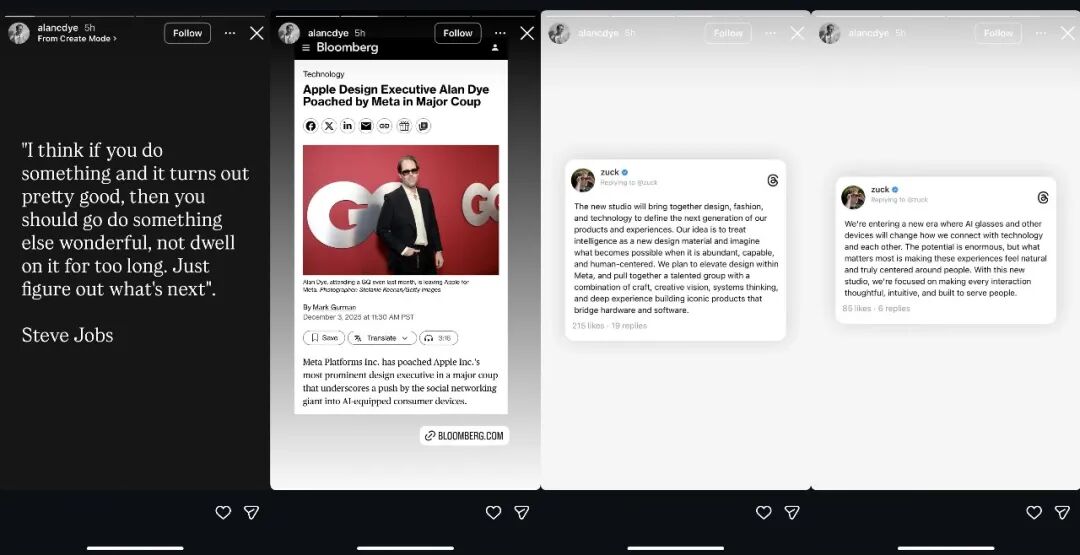 随后,戴伊也在Instagram发布图片临时动态,官宣跳槽,转发扎克伯格的帖子,还引用了苹果公司联合创始人、前CEO史蒂夫·乔布斯(Steve Jobs)的名言:“如果你做成了一件事,那就去做下一件更精彩的事,而不是在过去的成就上停留太久。想想接下来该做什么。”