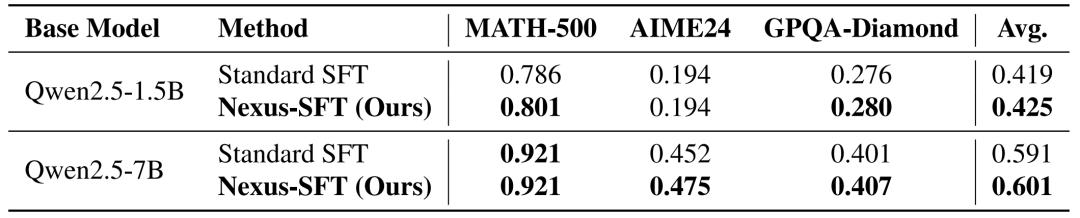 结果表明,在三个高难度数学推理基准上(MATH-500、AIME24、GPQA-Diamond),Nexus 均带来稳定提升: