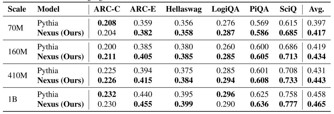 研究团队在 Pythia 系列(70M 到 1B)上从头训练 Nexus,并在六个标准推理数据集上评估:ARC-C、ARC-E、HellaSwag、LogiQA、PiQA和SciQ。