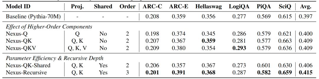 在Pythia-70M的消融实验中,使用权重共享的Nexus-QK-Shared版本,平均准确率仍比基线高出近1个百分点,而参数量毫无增加。