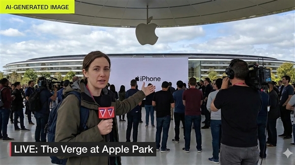最后,TheVerge的编辑要求Nano Banana生成一张“我司记者进行现场报道”的照片: