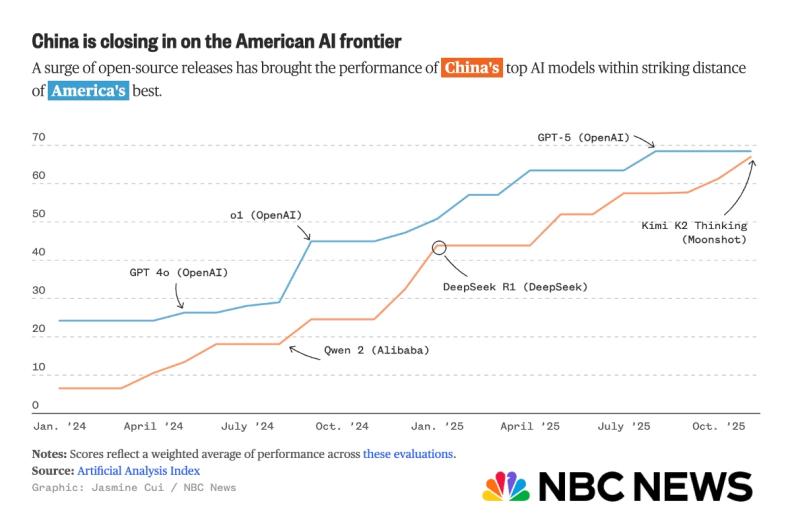 11月30日,美国NBC News报道,随着中国开源生态的崛起,以Kimi K2 Thinking模型为代表的中国顶尖模型,性能接近美国最优秀的水平。