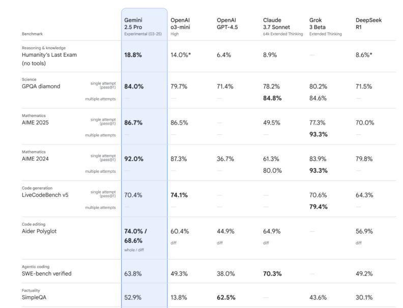 彼时,OpenAI惯用一种套路针对谷歌,即卡中其新模型的发布时间,提前一天发布自家产品。而这一次,谷歌“以其人之道还治其人之身”,把Gemini 2.5 Pro的发布提前到OpenAI产品发布的前一天。Gemini 2.5 Pro也不负众望,在多项指标上超过O3-mini,站上了最强模型的竞技场。