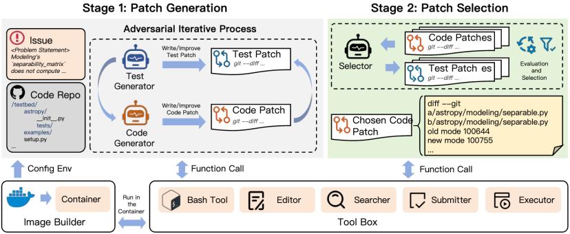 多智能体生成:基于对抗式的代码补丁与测试补丁双智能体生成