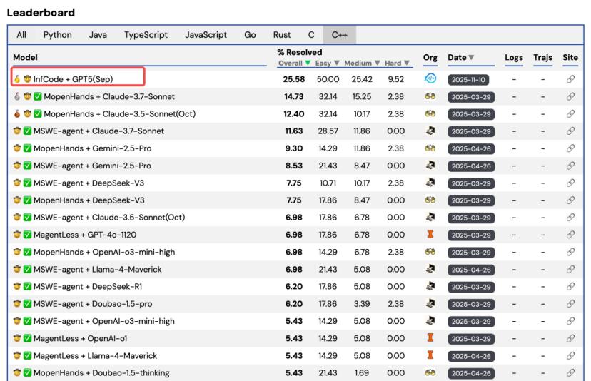 具体来说,InfCode 展现的不仅是单点技术突破。在 SWE-Bench Verified 上,它以 79.4% 的 Pass@1 得分拿下 SOTA,在 MultiSWEbench 的 C++ 子集上,更是以 25.58% 的解决率大幅领先 Claude 3.7 Sonnet 的 8.59% 和 DeepSeek V3 的 7.75%。