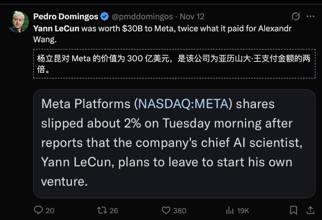 此前,媒体报道Yann LeCun计划离职后,Meta的股价下跌了2%。据此估计,Yann LeCun对Meta大概值300亿美元,是他新上司28岁的Alexandr Wang的两倍。