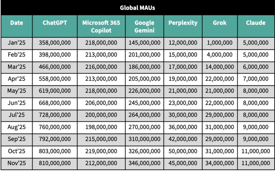 截至2025年11月,ChatGPT的全球月活同比增长180%,而Gemini同比增长170%。