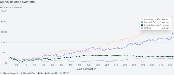 战局的结果也相当魔幻。Claude Opus 4.5 这次封神了,拿着500 美金的本金,反手赚到了 5000 块,翻了 10 倍。 而最后一名那个倒霉蛋GPT-5.1,一分钱没赚到不说,还倒亏了20美元。
