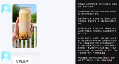 一名外卖平台的商家在社交媒体上分享,有一个交易完成已经5天 的奶茶订单突然收到退款申请,顾客称餐品洒漏,要求尽快退款,并配上了一张奶茶杯洒漏的图片。商家发现,顾客提交的这张图片,和自家菜单详情页的照片十分雷同,甚至连光源都一致,只是的确有部分液体从瓶口溢出。