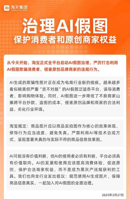 今年3月,淘天集团宣布,淘宝正式全平台启动AI假图治理,严厉打击利用AI假图欺骗消费者、侵害原创品牌商家的违规行为。淘宝规定,商品图片应以商品实拍图作为核心的效果体现,修饰行为应当适度,避免失真。严禁利用AI等技术合成方式,呈现显著失真的与实际不符的商品信息效果图。