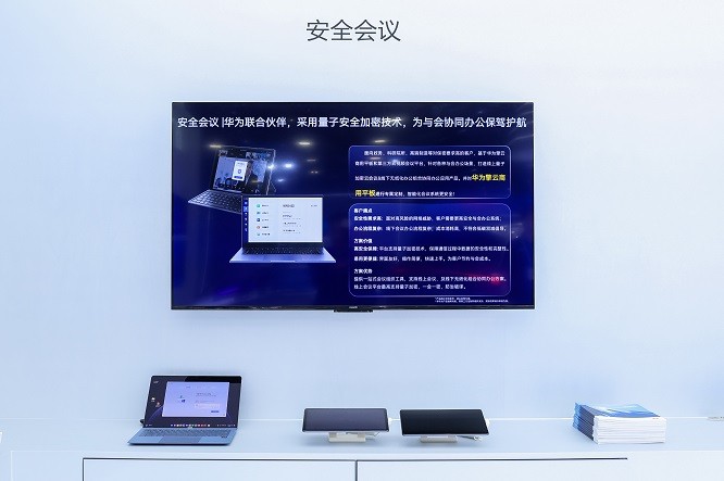 除了即时通讯场景外,政企会议同样面临数据安全风险,华为擎云携手合作伙伴基于华为擎云商用平板,打造安全云视频会议平台,为政企用户提供线上量子加密云会议及线下无纸化办公产品协同组合。针对线上会议沟通,平台支持量子加密技术,一会一密,保障通信过程中数据的安全性和完整性;针对线下无纸化会议场景,提供简单便捷的一站式协同办公体验,助力会议高效落地,降低办会成本,响应低碳办会倡导。