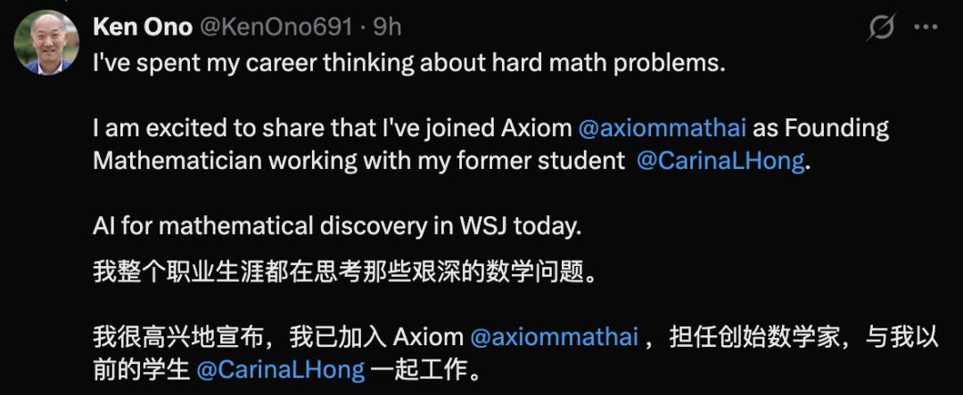 Ken Ono从弗吉尼亚举家搬到了数千公里之外的硅谷,加入了Carina Hong的AI初创公司Axiom Math。