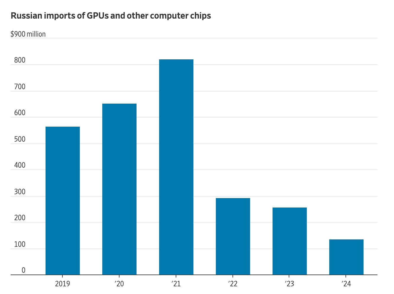此举导致俄罗斯突然无法直接购买对训练AI模型至关重要的高性能图形处理器(GPU),其中包括英伟达的最新芯片。《华尔街日报》对联合国贸易数据的分析显示,去年,俄罗斯进口的GPU及其他AI开发必备计算机芯片数量,较战前下降了84%。