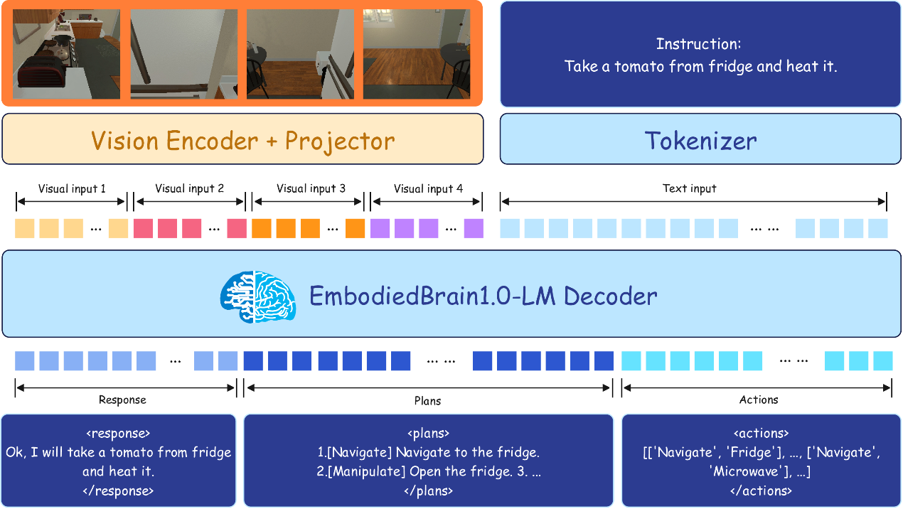 模型以Qwen2.5-VL为基础,创新采用模块化编码器-解码器架构,打通"感知-推理-行动"全链路。原生分辨率视觉Transformer凭借窗口注意力机制与二维旋转位置编码,精准捕捉图像细节与空间几何关系;轻量级MLP融合器高效对齐视觉与语言模态语义;基于Qwen2.5初始化的解码器引入时间对齐多模态ROPE技术,强化长视频时序理解能力。最终输出自然语言响应、分步规划与可执行动作序列的结构化结果,实现从语义理解到物理执行的直接闭环,对于"从冰箱取番茄并加热"这类任务可生成清晰的导航与操作步骤及对应动作指令。
