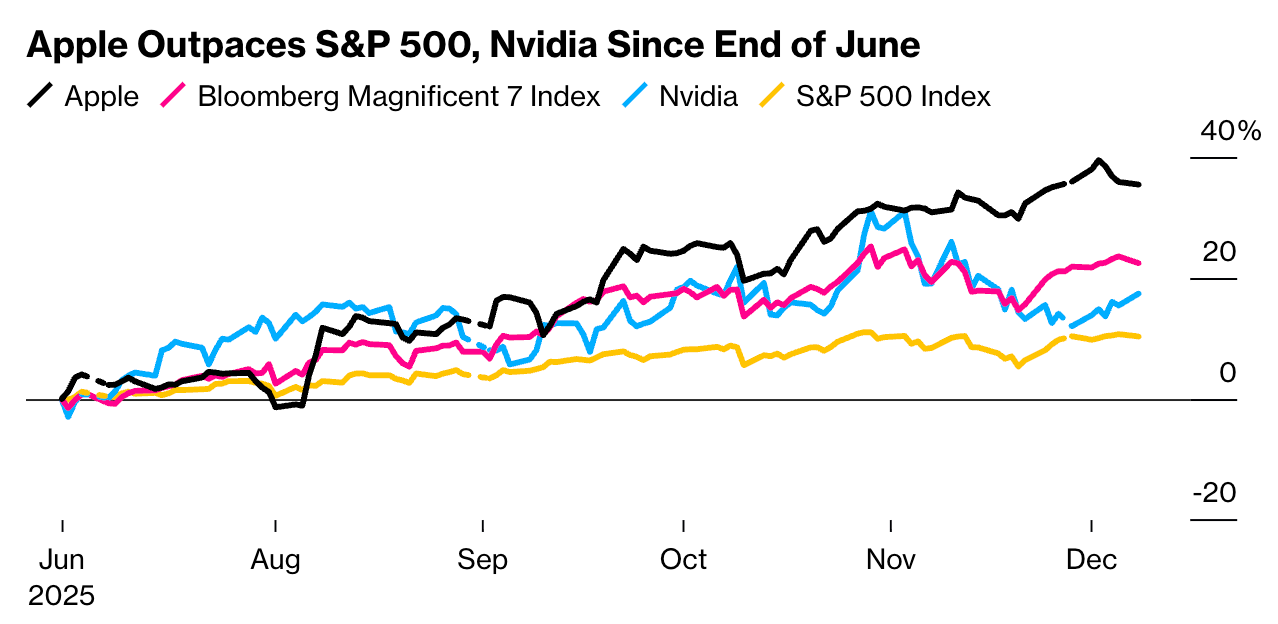 2025年前6个月,苹果在美股“科技七巨头”中表现倒数第二,截至6月底股价累计下跌18%。但是从那以后,情况发生逆转,苹果股价飙升35%,而Meta和微软等AI宠儿的股价转为下跌,就连英伟达也表现不佳。同期,标普500指数上涨10%,科技股占比较高的纳斯达克100指数上涨13%。