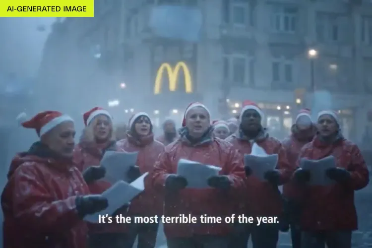 这则广告展示了由 AI 生成的人物接连遭遇各种冬季烦恼:家庭聚餐、购物、唱圣诞颂歌、烤饼干以及装饰圣诞树,而每项活动都以某种方式出了差错。广告最后建议观众:“躲进麦当劳,一直待到一月到来。”