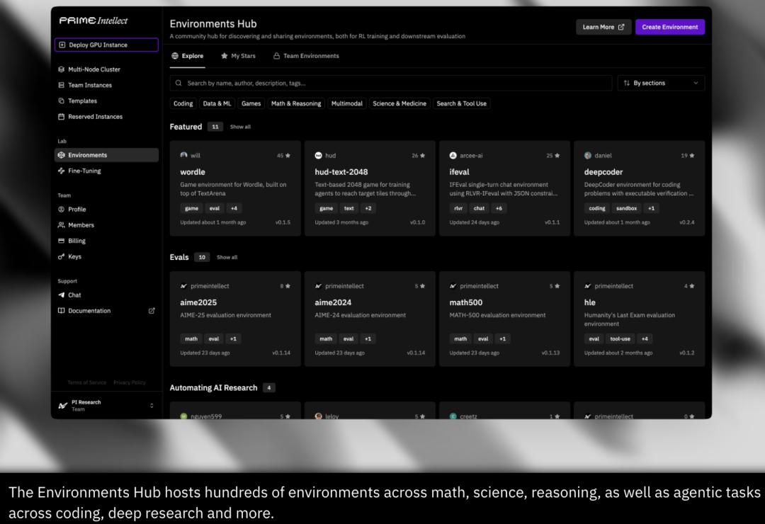 INTELLECT-3的训练环境由Verifiers库构建,并托管于Environments Hub,这是Prime Intellect面向社区的RL环境与评测中心。