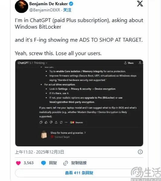 如果真的不涉及经济利益,为何ChatGPT的回答中只会出现特定品牌,甚至有ChatGPT Plus用户直白地表示,“别侮辱你的付费用户。”不得已,ChatGPT负责人Nick Turley亲自发文澄清,“目前没有针对广告的实时测试,你看到的任何截图要么是假的,要么就不是广告。”