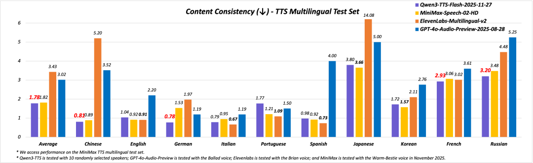 多语种多方言能力持续增强:Qwen3-TTS 支持中文、英文、德语、意大利语、葡萄牙语、西班牙语、日语、韩语、法语、俄语等 10 大主流语言,在 MiniMax TTS multilingual test set 上,平均词错误率(WER)优于 MiniMax、ElevenLabs 及 GPT-4o-Audio-Preview;支持更多音色的方言生成,包括普通话、闽南语、吴语、粤语、四川话、北京话、南京话、天津话和陕西话,还原地方口音特色与语言神韵。