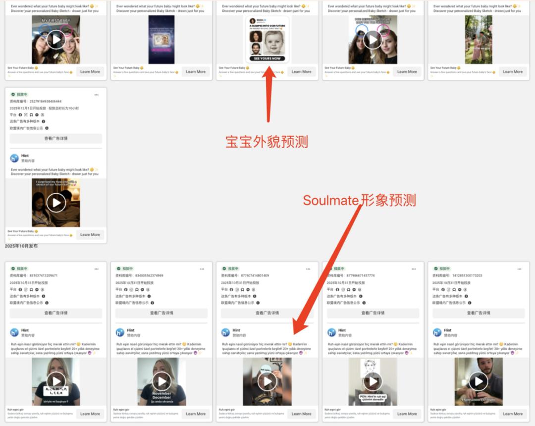 根据广告素材看,Hint 近期在投的广告达到 27 条,主要都来自于两个投放高峰 10月和 12月,并分别以“Soulmate”和“宝宝外貌预测”为核心功能,而 11月则没有持续投放的广告素材,素材投放时间均不到 1 天,更像是在测试素材。