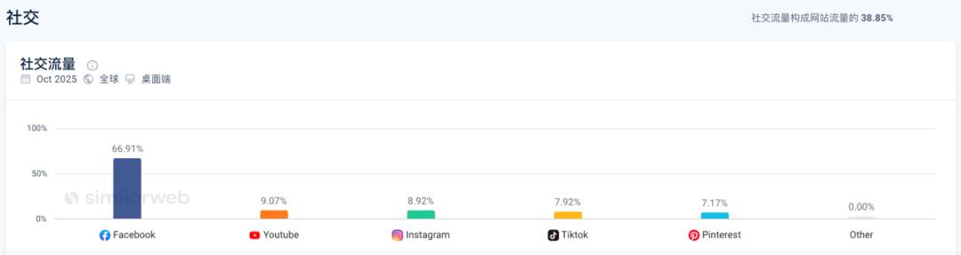 从 Similarweb 给出的 10 月流量情况看,Hint 直接访问和社交流量来源占比最高,分别占 47.34% 和 38.55%,而自然搜索流量仅有 8.24%,与其他 Web 端产品“直接访问+自然搜索为主”的流量结构有所不同。而从具体社媒平台看,相比此前 Starla 以 TikTok 为主的策略,Hint Facebook 平台的流量占比为 66.91%,远超其他平台。