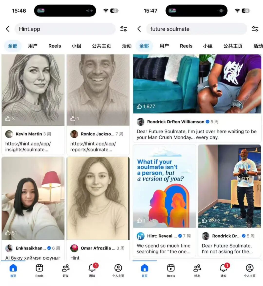 而在 FB 搜索关键词来看,会有部分用户分享 Hint 生成的 Soulmate 画像,而这些画像看上去年龄也稍大一些。但从点赞数量来看,基本都不过百,传播度可能并没有那么高。