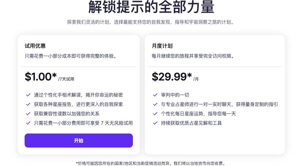 但相比较而言,真人占星师的成本显然高于 AI,所以,Hint 采用了比较激进的变现策略,不仅要求订阅才能使用,且订阅价格较高(29.99 美元/月 ),而且用户解锁 7 天试用,这样在所有网站或 app 几乎都免费的项目,Hint 都需要支付 1 美元才能解锁,以筛选真正愿意付费的用户。