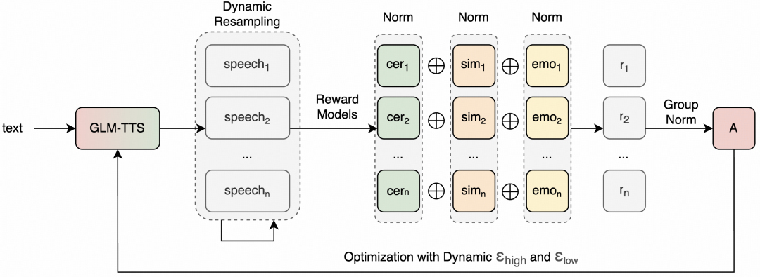 然而,在 TTS 领域,奖励设计难、训练不稳定等问题长期存在,业界多停留在 SFT 阶段。GLM‑TTS 基于 GRPO 框架,引入多维度奖励和稳定训练机制,在可控前提下提升模型的表达力和鲁棒性。
