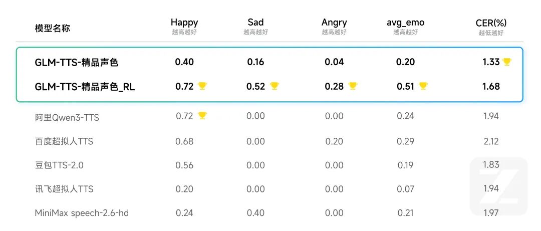 兼顾发音准确度:在情感表现领先的同时,GLM‑TTS 的 CER 仍保持较低水平: