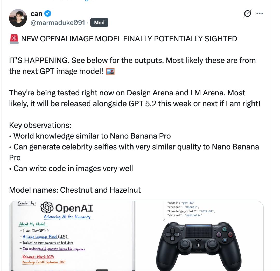 此外,x 上还曝出,OpenAI 已悄悄已在 Design Arena 与 LM Arena 平台开启盲测新的图像生成模型,新模型名称:“Chestnut”和“Hazelnut”,结果接近 Nano Banana Pro。