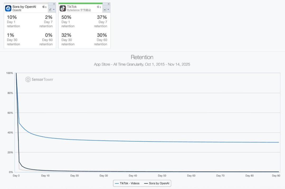 根据 a16z 合伙人 Olivia Moore 前段时间的数据,Sora 留存率远不如 TikTok,首日留存率只有 10%,30 天留存率只有 1%。她认为,模型确实具备病毒式传播的潜力,并且有一批核心用户在制作和导出 Sora 视频。不过,大多数用户并没有在应用上停留。而 Altman 此举,则意味着一次重大的战略纠偏。